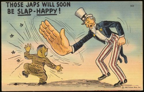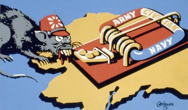 This cartoon was created and widely circulated in 1942 (1942 is right in the middle of World War Two.) Circle any key details you notice in the show your work tab.