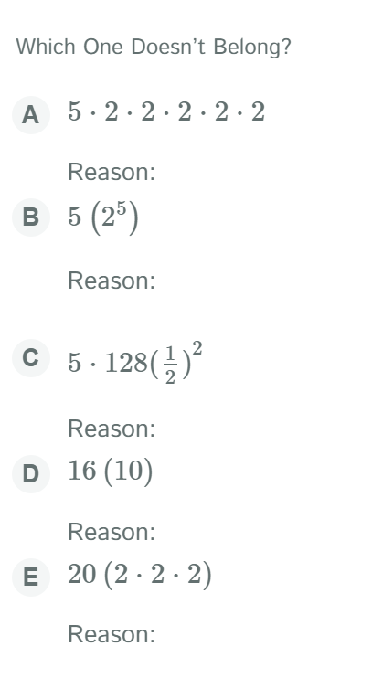 Which doesnt belong?In the space provided, write the letter of the choice below that you believe doesnt belong and give a reason. (Showing your work is not required)