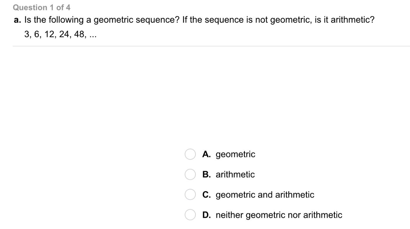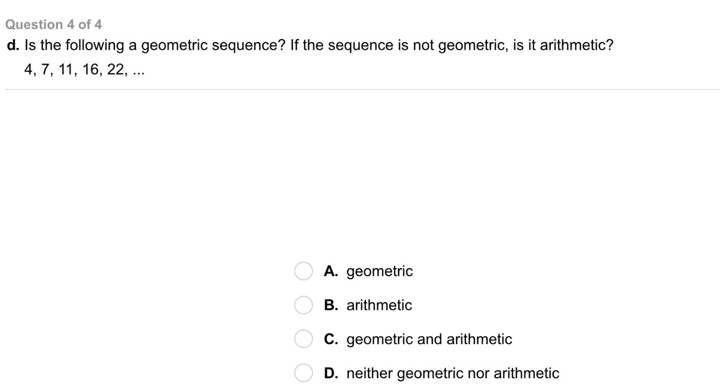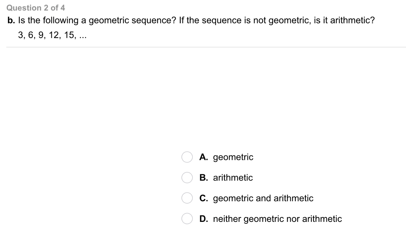Categorize each represenation as an example of an arithmetic sequence or geometric sequence.