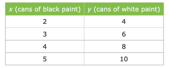 King High School has asked Krysta to paint some murals around the school, and Krysta is thrilled! Her mural in the main office will show a ray of sunlight breaking through storm clouds. Krysta creates the perfect gray for storm clouds.Krysta mixes together.There is a proportional relationship between the number of cans of black paint,x,and the number of cans of white paint,y,