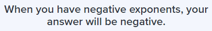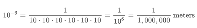 Since negative exponents represent division, a number to a negative power represents a fraction of 1. Biologists and doctors often write the size of cells and other microscopic organisms using negative exponents. In general, the size of a human cell is about 10−6 meters. This expression simplifies to the following:
