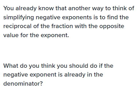 Another way to think of negative exponents is to find the _______ of the fraction with the opposite value for the exponent