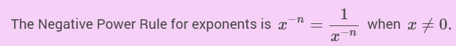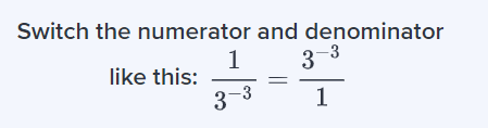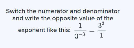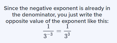 To convert a negative exponent to a positive exponent, move the base to the other side of the fraction and write the opposite value of the exponent.
