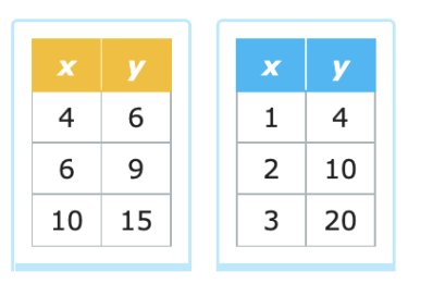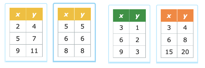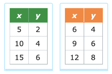 Select the tables that show a proportional relationship between x and y.