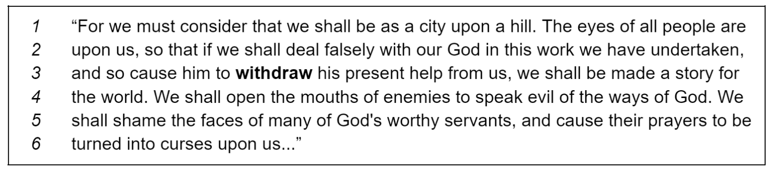 Winthrop states that the Massachusetts Bay Colony is seen as a “city upon a hill” because the Puritans are