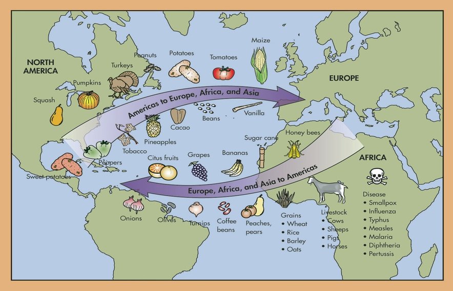 The Columbian Exchange refers to the widespread transfer of _______ , plants, culture, human populations, _______ , and ideas from the “Old” World (i.e. Europe, Asia, and Africa) and “_______ ” World (i.e. North, Central, & South America).
