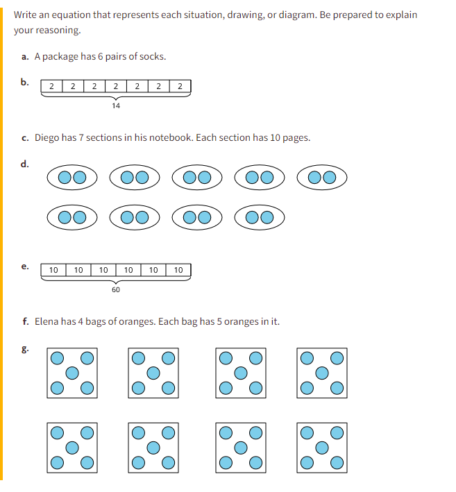 Relate equations to multiplication situations and diagrams.
