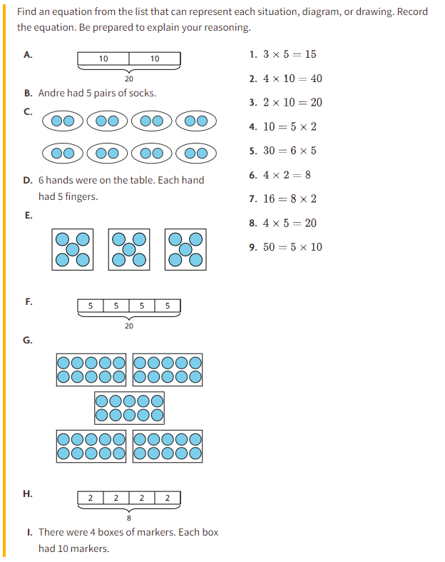 Complete A. - I. Find an equation from the list that can represent each situation, diagram, or drawing. Record the equation. Be prepared to explain your reasoning.