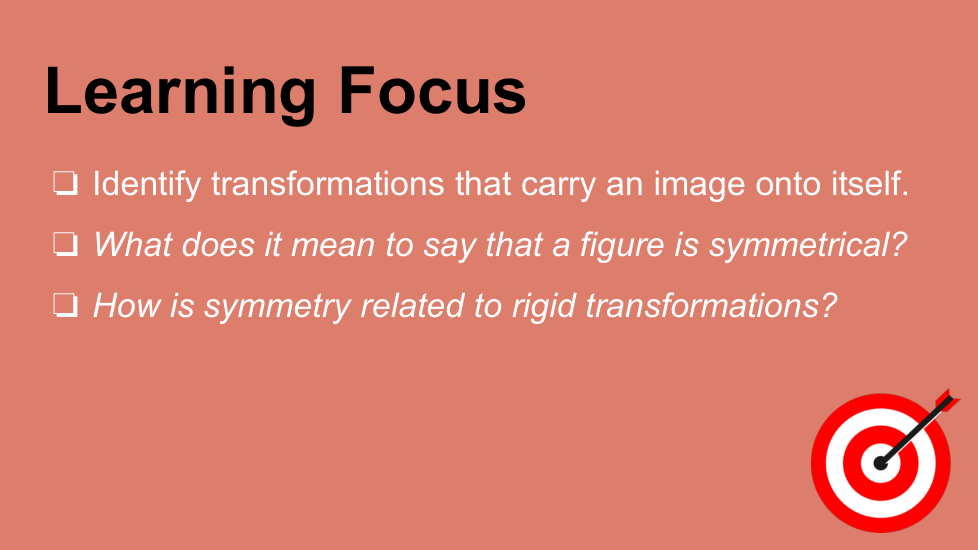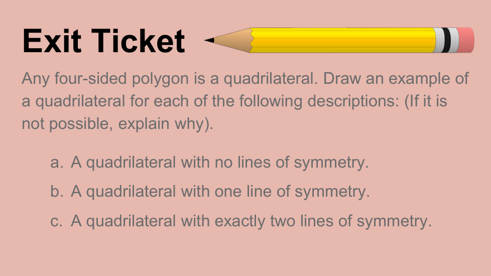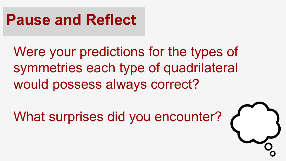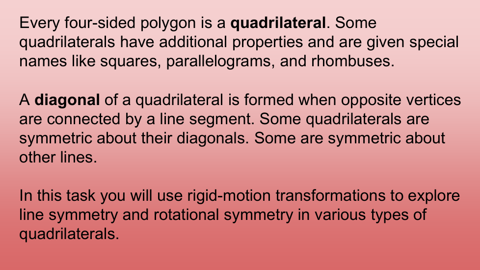 En esta tarea, utilizará transformaciones de movimiento rígido para explorar la simetría lineal y la simetría rotacional en varios tipos de cuadriláteros.
