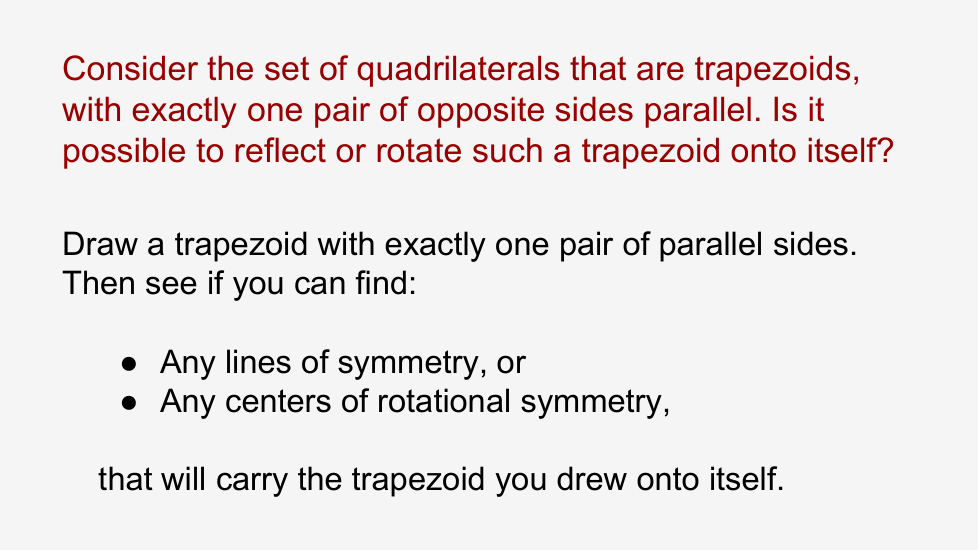 Considere el conjunto de cuadriláteros que son trapezoides, con exactamente un par de lados opuestos paralelos. ¿Es posible reflejar o rotar dicho trapezoide sobre sí mismo?