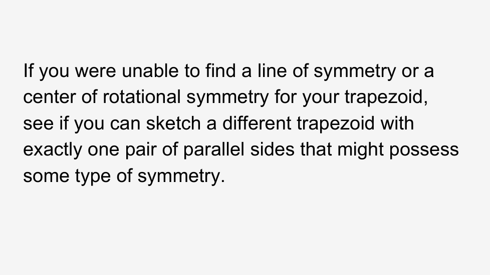 Si no pudo encontrar una línea de simetría o un centro de simetría rotacional para su trapecio, vea si puede dibujar un trapezoide diferente con exactamente un par de lados paralelos que puedan tener algún tipo de simetría.