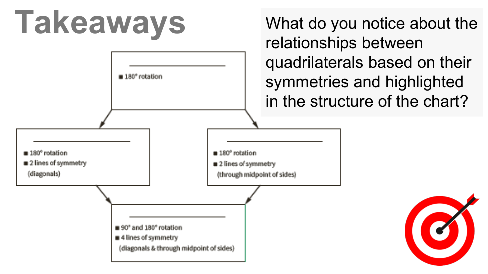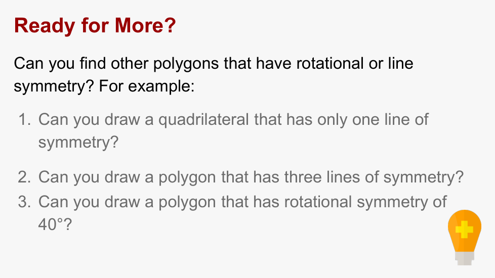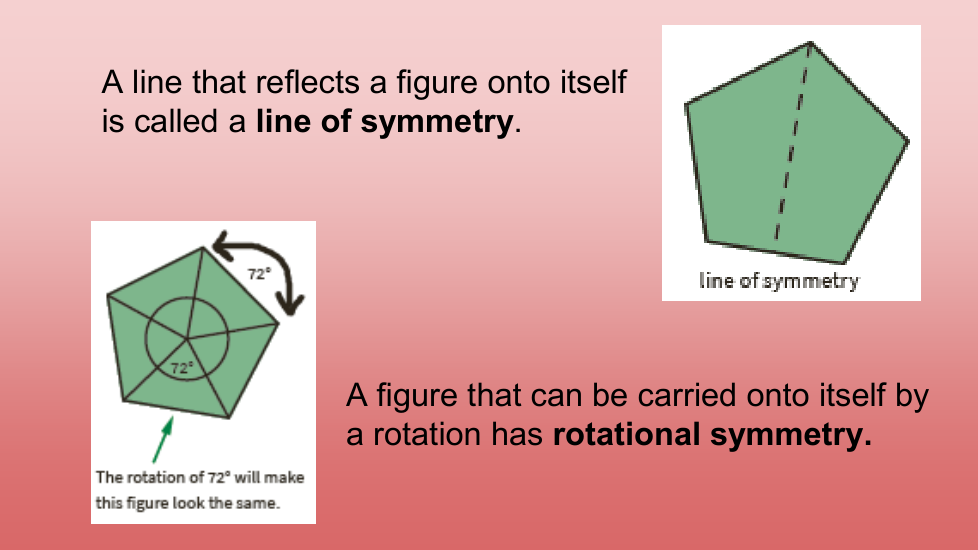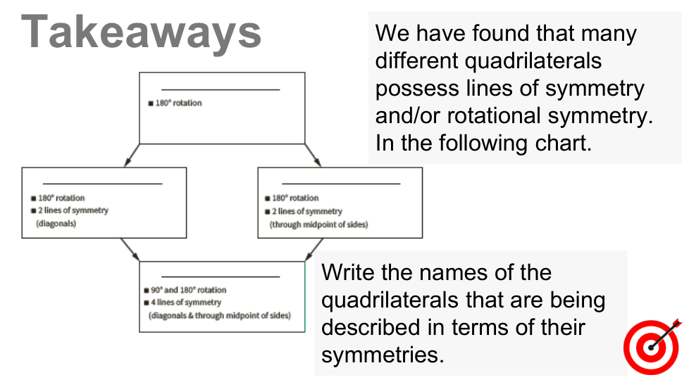 In this lesson, we explored line and rotational symmetry in different types of quadrilaterals. A figure is symmetric if a figure can be reflected across a line or rotated about a point onto itself. We found that diagonals and lines connecting the midpoints of opposite sides of a quadrilateral might be lines of symmetry, depending on the quadrilateral, and the point of intersection of the diagonals is the center of rotation for parallelograms, rectangles, rhombuses, and squares. The possible angles of rotation vary depending on the quadrilateral, but are always multiples of 90o.
