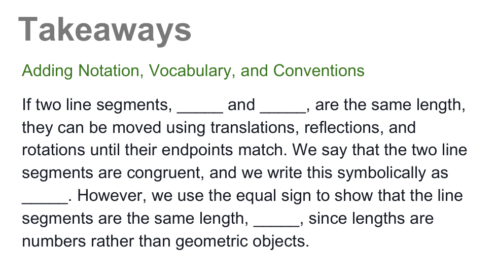 , tienen la misma longitud, se pueden mover mediante traslaciones, reflexiones y rotaciones hasta que sus extremos coincidan.