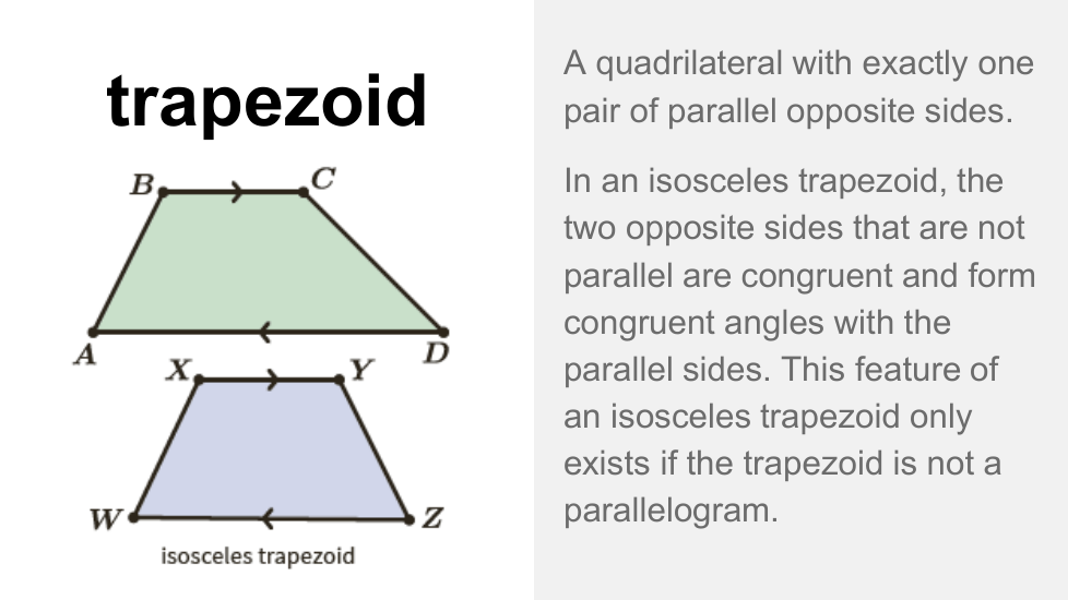 En un trapezoide isósceles, los dos lados opuestos que no son paralelos son congruentes y forman ángulos congruentes con los lados paralelos. Esta característica de un trapezoide isósceles solo existe si el trapezoide no es un paralelogramo.