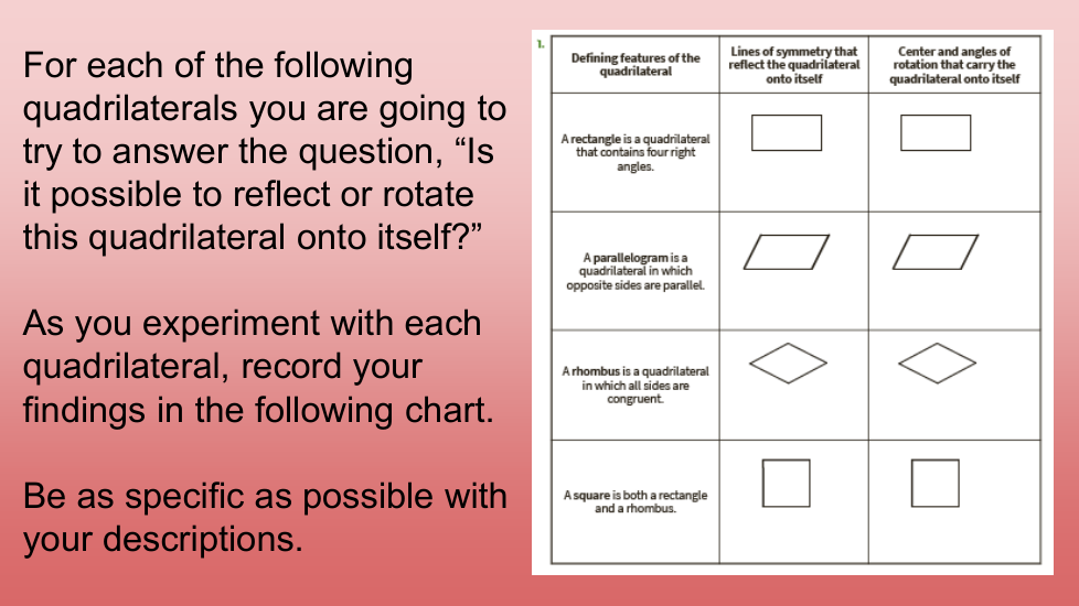For each of the following quadrilaterals you are going to try to answer the question, “Is it possible to reflect or rotate this quadrilateral onto itself?”