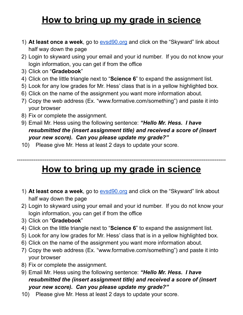 If you get a 100% the first time you submit this, AND have the "How to bring up my grade in science" paper glued into your spiral, Mr. Hess will give you a sucker.