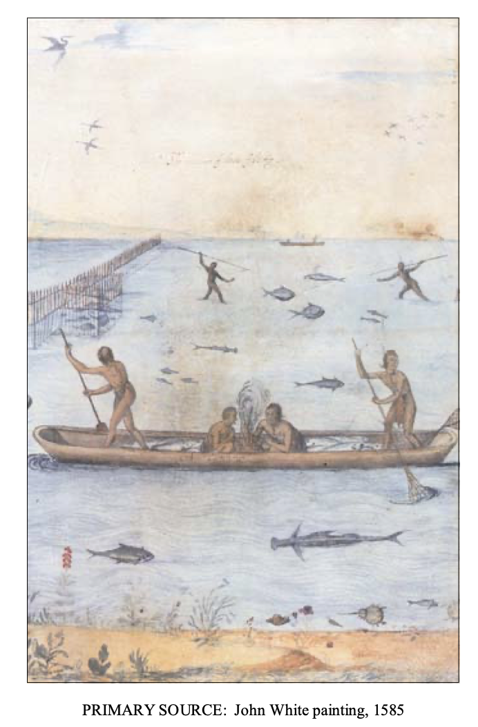 The Native Americans used natural resources in every aspect of their lives. They used animal skins (deerskin) as clothing. Shelter was made from the material around them (saplings, leaves, small branches, animal fur). Native peoples of the past farmed, hunted, and fished. They used natural resources such as rock, twine, bark, and oyster shell to farm, hunt, and fish.