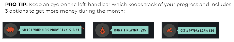 Living paycheck to paycheck means that you need every bit of your paycheck to meet your expenses which drains your balance back down to near $0 before your next paycheck arrives...and then you start the cycle again. As a result, you don’t have savings to fall back on, every dollar counts, and you’re faced with tough decisions on a daily basis. In this activity, you’ll experience what it’s like to live paycheck to paycheck by playing the game Spent. At the start of the game, you are faced with the following scenario: