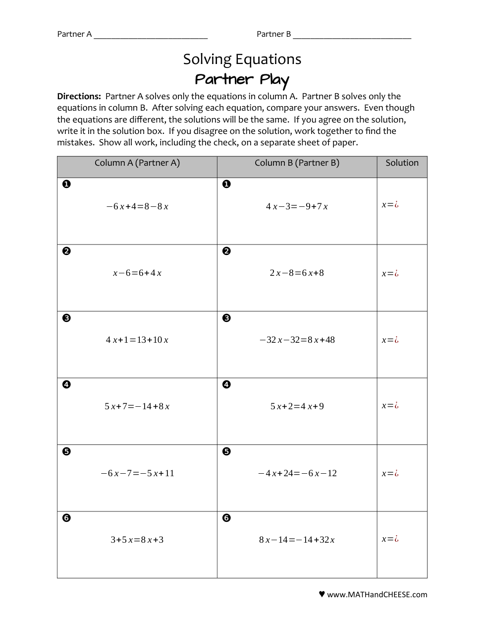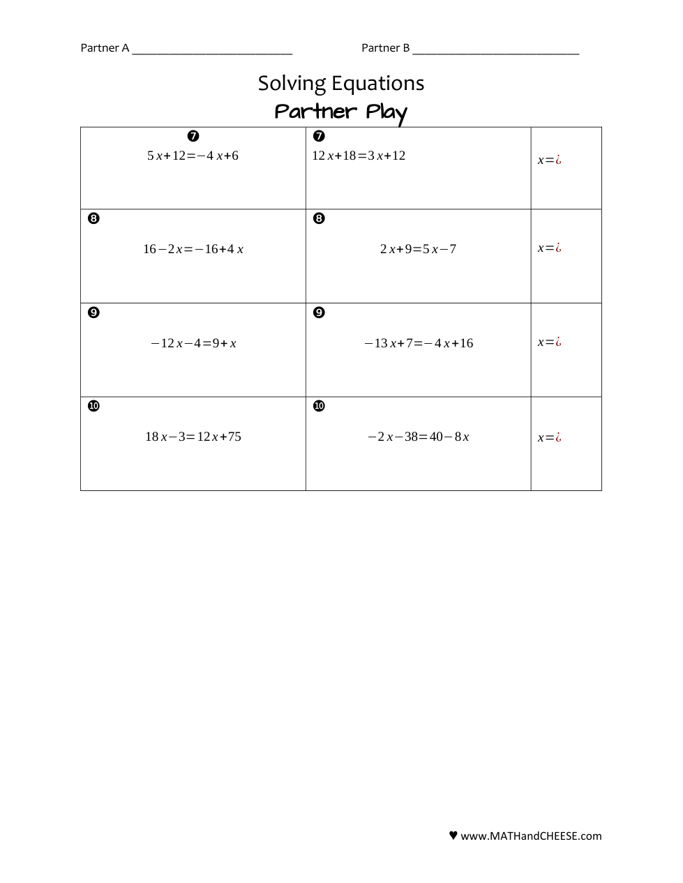 You are working with ONE partner. You will choose who is partner A and who is partner B. You will solve the problems on partner A or partner B side only. The answers are the same for both.