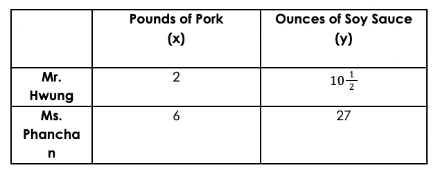 Meal Prep—Mr. Hwung and Ms. Phanchan are both preparing marinated pork belly for their lunches this week. Is there a proportional relationship between the amount of pork and the amount of soy sauce in their recipes?