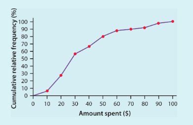 The following figure is a cumulative relative frequency graph of the amount spent by a sample of 50 grocery shoppers at a store.