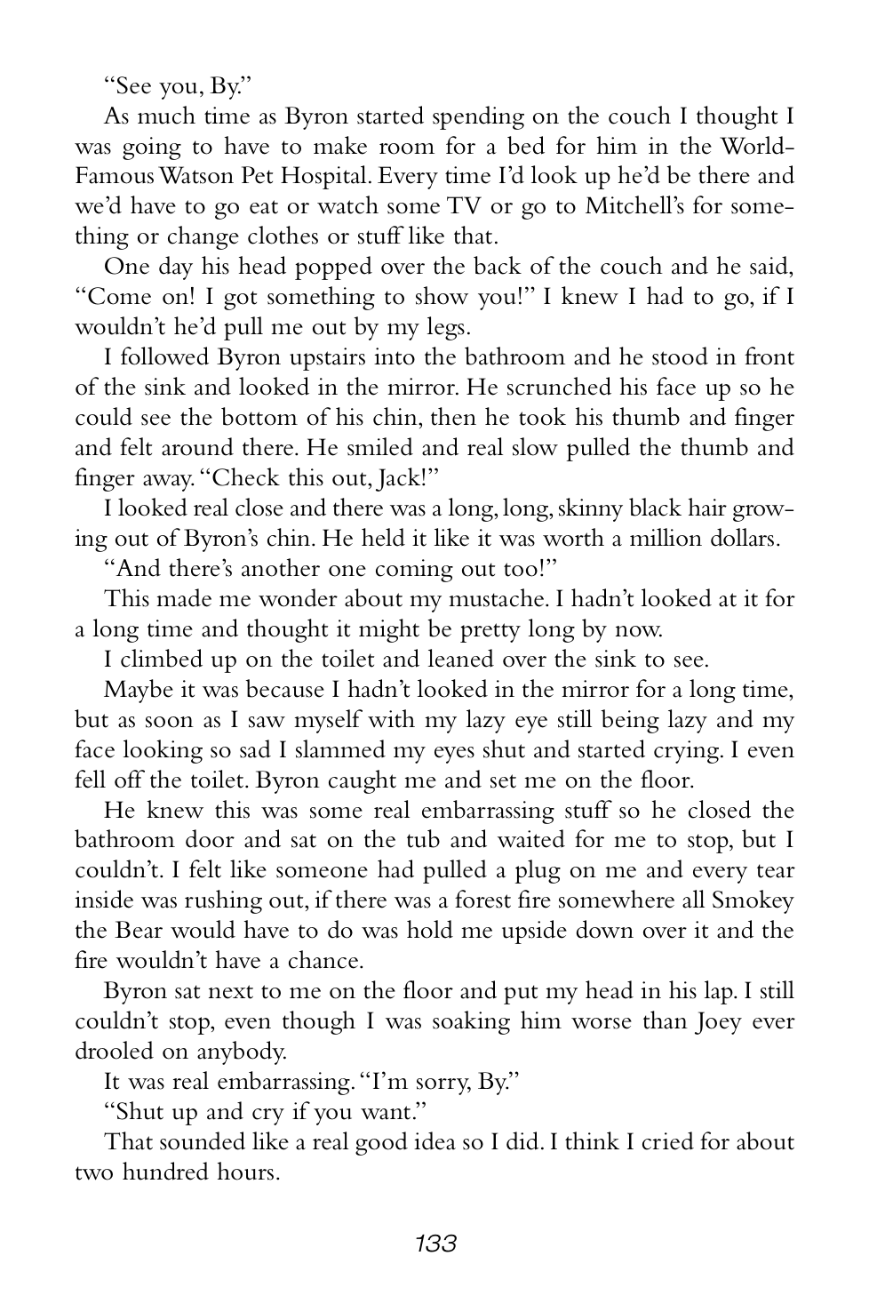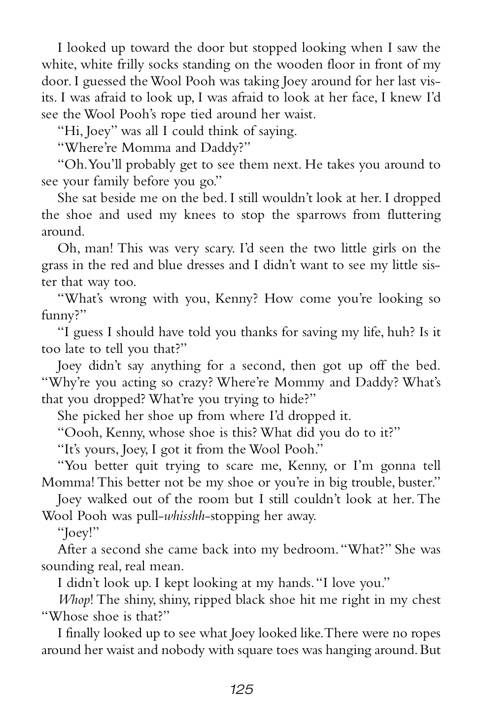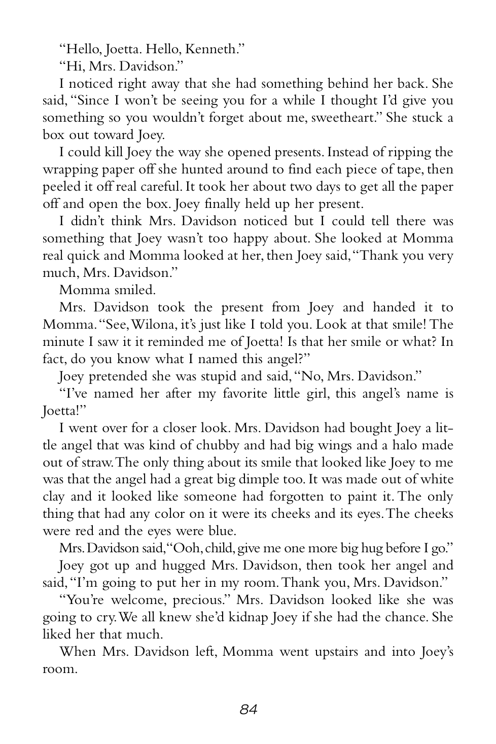 “I don’t know what got Joey started but she was off to the races with her tears. She was the only one who’d practiced what she’d say to Grandma Sands. She sniffed a couple of times then said, ‘Hi, Grandma Sands, it’s a really pleasure to meet you.’ You could only half understand what she was saying, she was blubbering so much.”