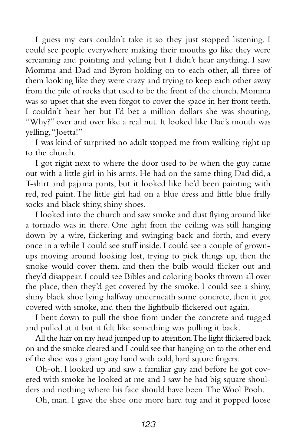 “...the guy came out with a little girl in his arms. He had on the same thing Dad did, T-shirt and pajama pants, but it looked like he’d been painting with red, red paint.”