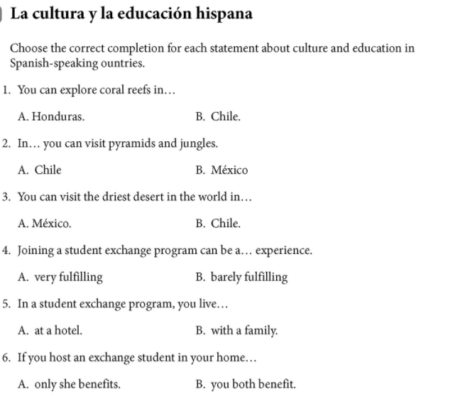 Los chicos _______ (hablar) mucho en la clase de Historia. Yo _______ (hablar) con el profesor de biologĂa. Nosotros _______ (necesitar) unos lapices de color para la clase de arte. TĂș _______ (necesitar) un cuaderno para la clase de InglĂ©s. Ella _______ (necesitar ) una mochila para ir al colegio. Armando y Juan _______ (llevar) una camisa anaranjada al colegio. Mi amiga _______ (llevar) una falda roja al cine. Las clases _______ (terminar) a las dos y cuarto de la tarde.