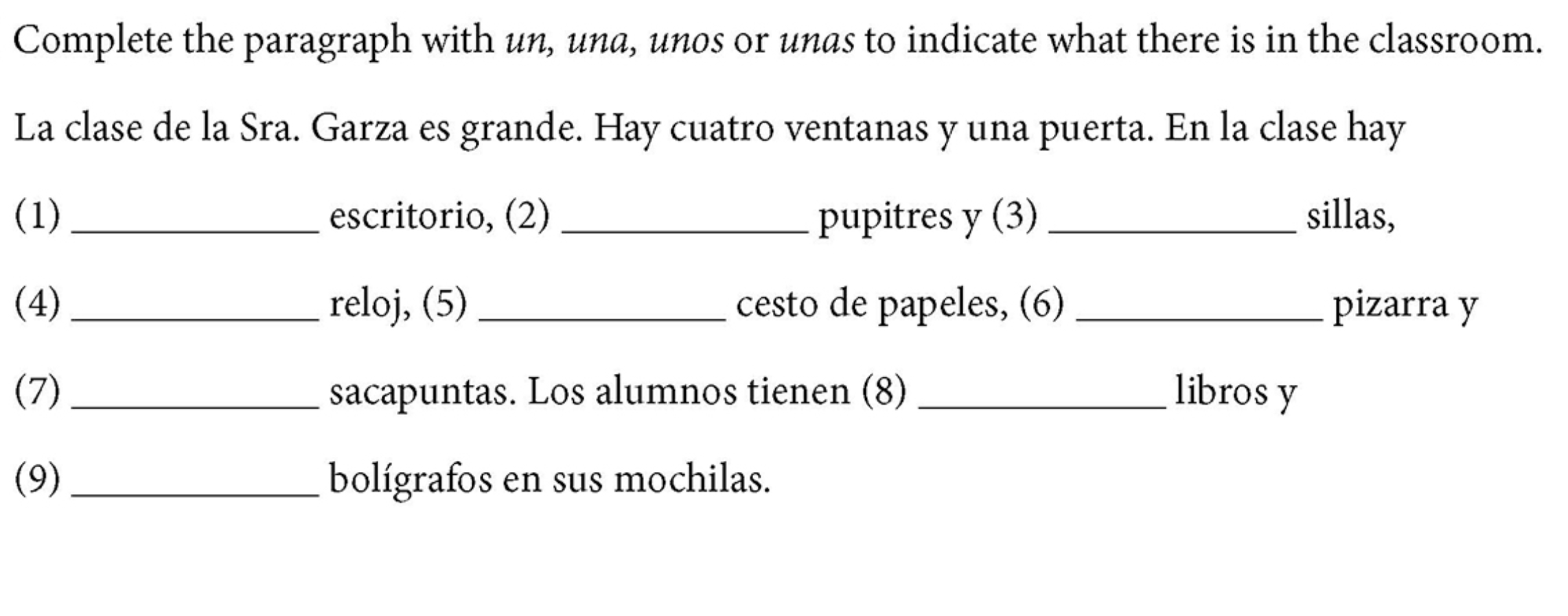 Complete the paragraph with UN, UNA, UNOS, OR UNAS to indicate what is in the classroom.