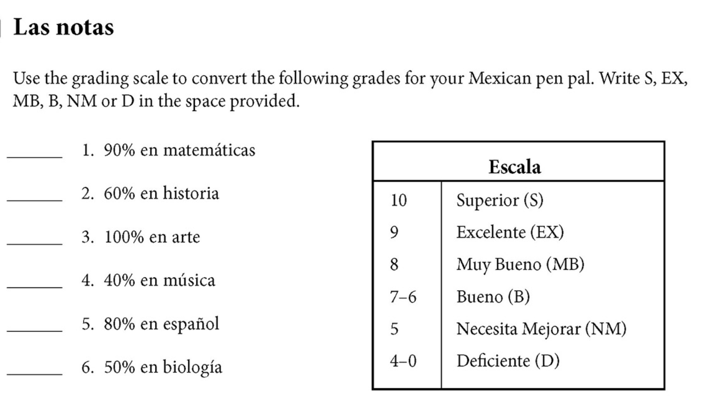 Choose S, EX, MB, B, NB, OR D using the grade scale to convert the following grades for your Mexican pen pal.