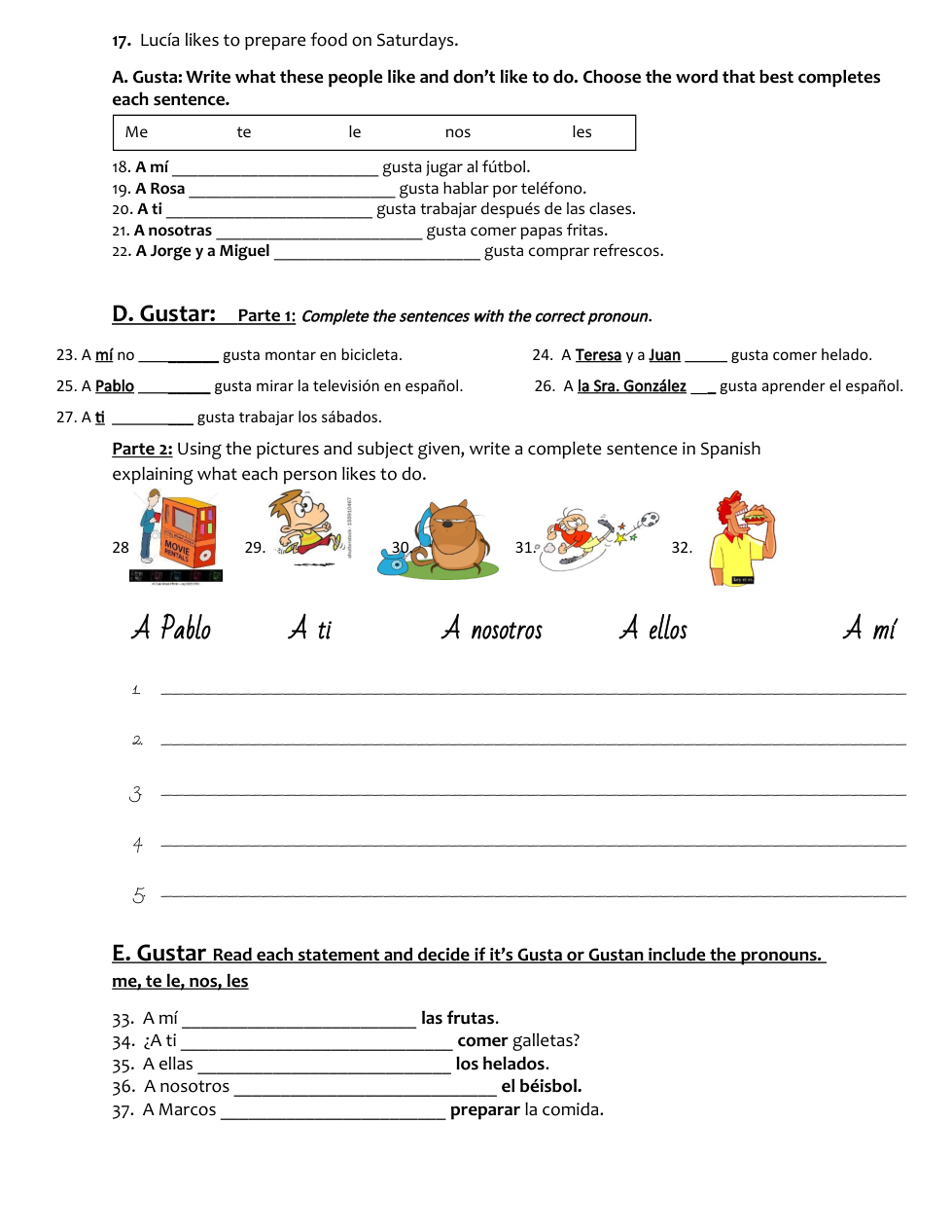 E. Gustar: Read each statement and decide if it's Gusta or Gustan. Include the pronouns me, te, le, nos, les . You do not need to rewrite the entire sentence.