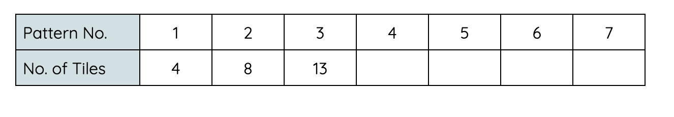 Complete the following table by counting the total number of tiles in each pattern: