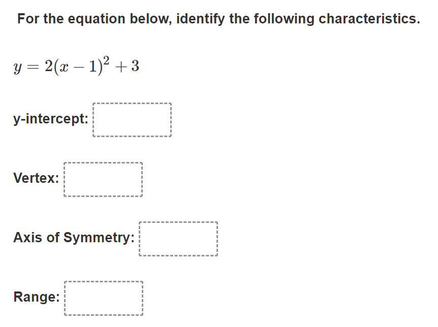 For the equation: range: (interval notation)--(the 'picture' says vertex...but I'm looking for range here)