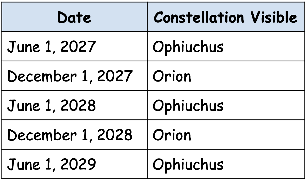 Using the patterns in the data table above, what constellation would be visible on December 1, 2038?