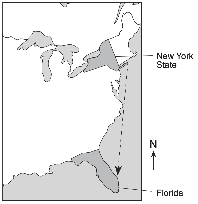 The dash line on the map below shows a ships route from Long Island, New York, to Florida. As the ship travel south, the star Polaris appears to lower in the northern sky each night.