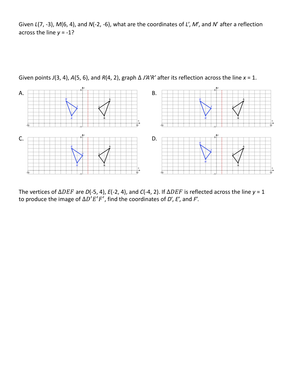 Given points J(3, 4), A(5, 6), and R(4, 2), which graph represents triangle J'A'R' after its reflection across the line x = 1.