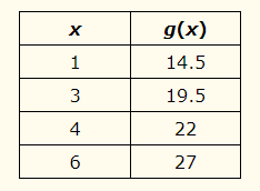 Eric compares the function f(x) = 5x + 10 to the linear function g(x) in the table below.