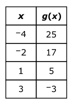 AJ compared the function f(x) = –4x + 1 to the the linear function, g(x), in the table below.