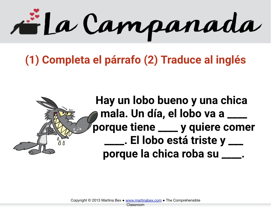 Write a sentence (in Spanish) to describe the illustration (based on the story about the wolf and the girl).