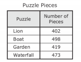 The table shows the numbers of puzzle pieces in four puzzles. Derek put together the two puzzles that had the greatest numbers of pieces.