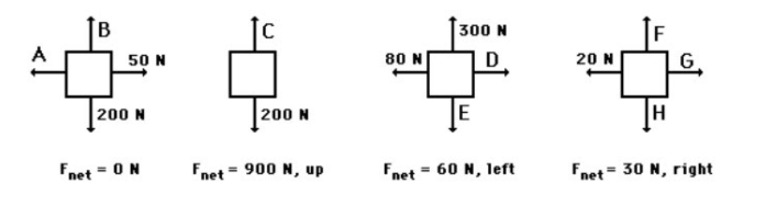 Free-body diagrams for four situations are shown below. For each situation, determine the net force acting upon the object. Be sure to give the magnitude, unit, and direction of the net force. If no net force is present, just answer "balanced.