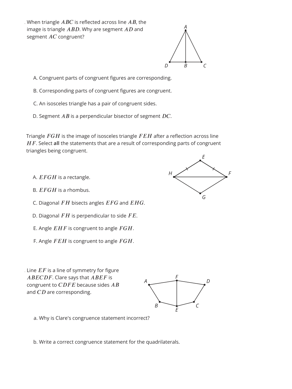 Triangle FGH is the image of isosceles triangle FEH after a reflection across line HF. Select all the statements that are a result of corresponding parts of congruent triangles being congruent.