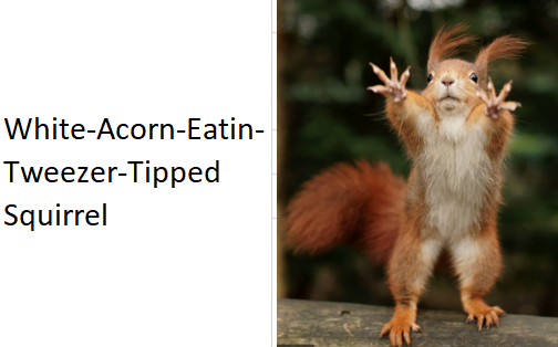 The White-Acorn-Eatin-Tweezer-Tipped-Squirrel. Unlike the other squirrels that are generalists, capable of eating all acorns the White-Acorn-Eatin-Tweezer-Tipped-Squirrel only feeds on white beans. Like other tweezer tipped squirrels it feeds using a modified snout shaped like a tweezers.