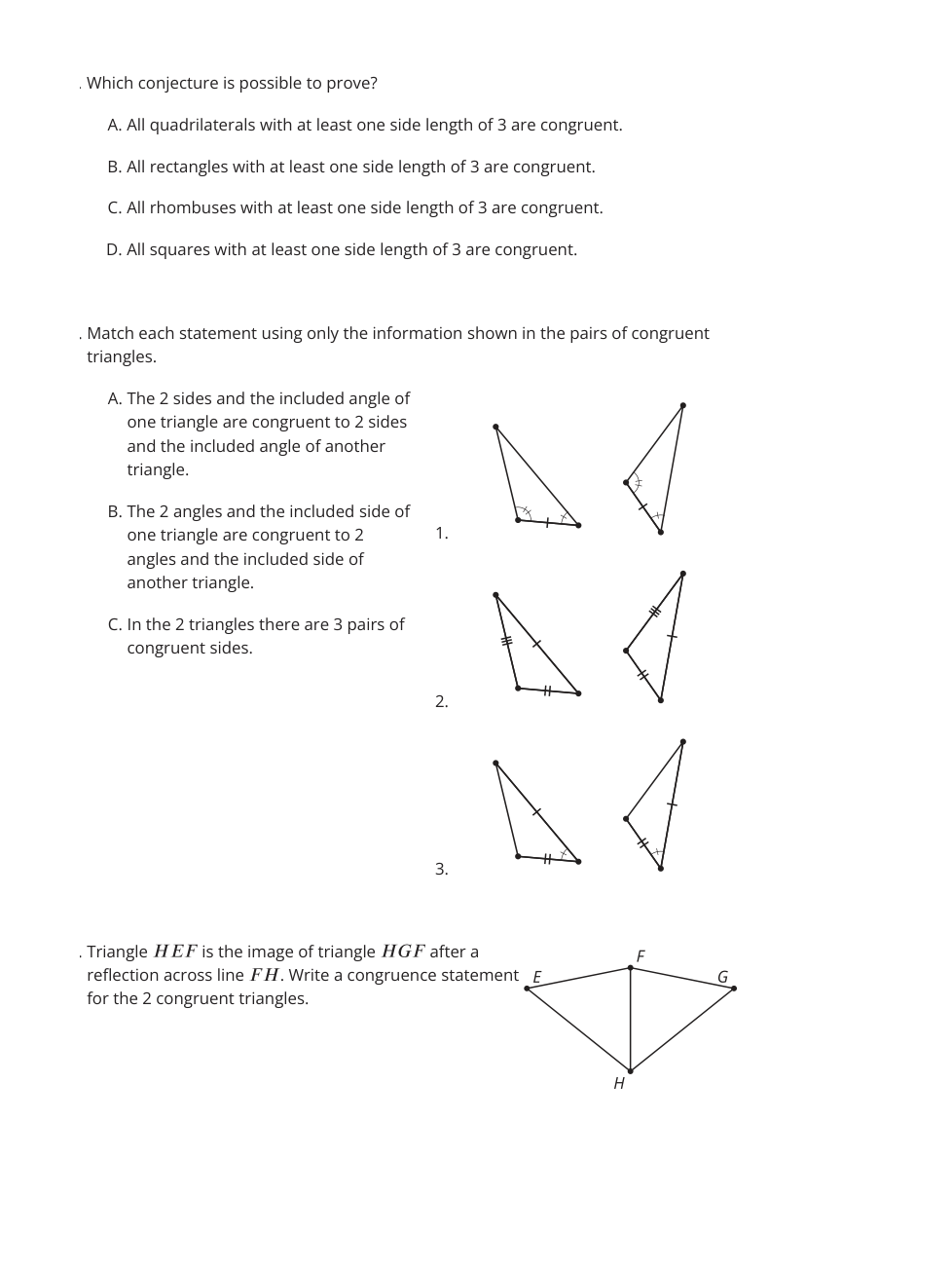 B. The 2 sides and the included angle of one triangle are congruent to 2 sides and the included angle of another triangle. | arrow_right_alt | 3 |