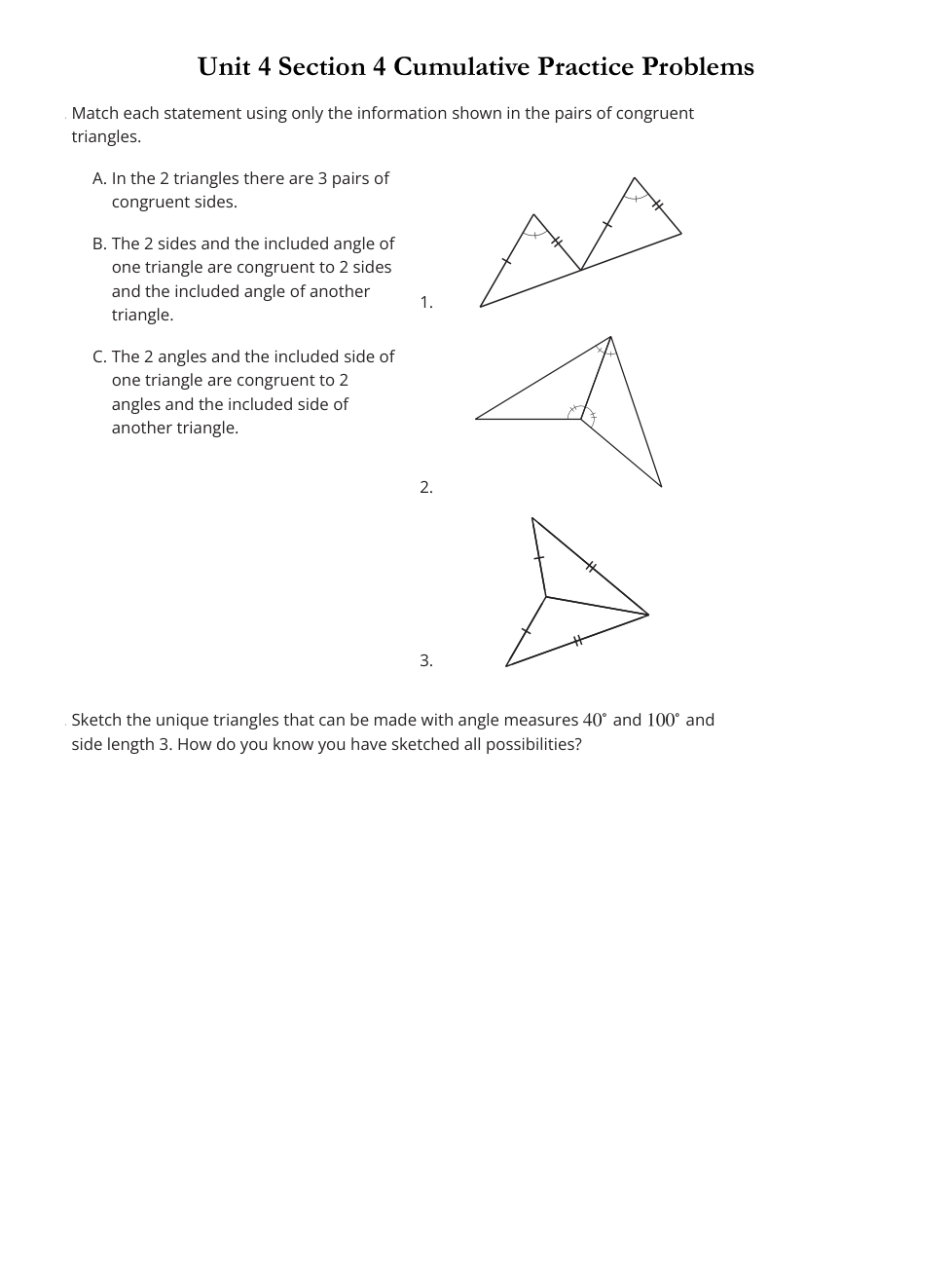 Sketch the unique triangles that can be made with angle measures 40o and 100o and side length 3.