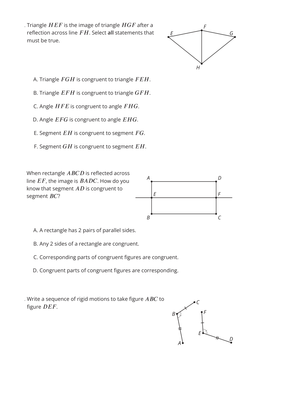 Select all of the sequences of rigid motions that would transform figure ABC to figure DEF.