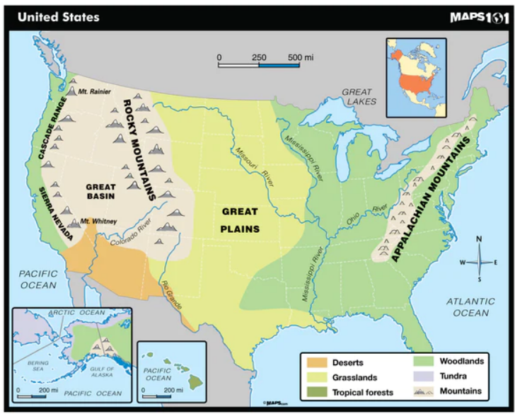 Based on the physical map, what type of land is found in Florida? (Hint: Its not tropical forests.)