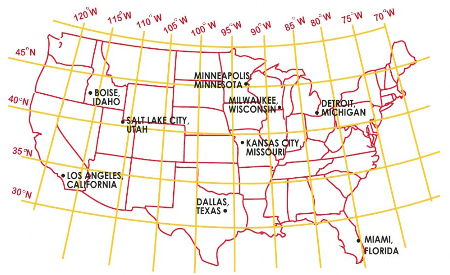 Based on the map, what is the name of the city and state that matches the coordinates below?