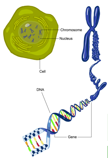 Chromosomes inside the nucleus of cells are made up of DNA (deoxyribonucleic acid), a long, twisted, ladder-shaped molecule. DNA is the source of the coded instructions. Chromosomes are divided into short segments of DNA called genes, each with a specific purpose. Each chromosome has many different genes lined up one after the other along the chromosome. You can think of the DNA as a cookbook, and the genes are the individual recipes in that cookbook.