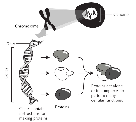 Every gene has a set of instructions for making a specific set of proteins. Protein structure influences protein function (ex: the structure of some blood proteins allows them to attach to oxygen, and the structure of a normal digestive protein allows it to break down particular food